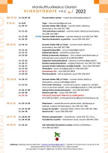 Joulu on jo nurkan takana, joten Glorian ryhmät jäävät tämän viikon jälkeen tauolle, ja jatkuvat jälleen tammikuussa. Keskiviikkona vietetään korealaista iltaa, ja torstaina tonttuillaan Glorian ja Paremmin Yhdessä ry:n pikkujouluissa. Tervetuloa mukaan! 🎄